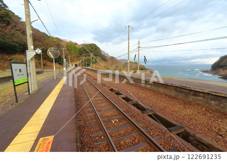 山陰本線 鎧駅と日本海(兵庫県香美町)