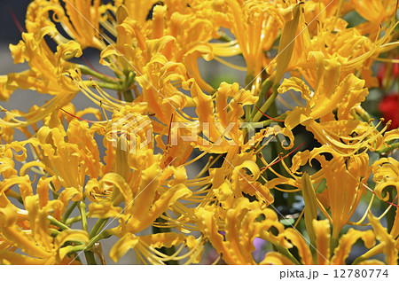 燈籠の前に咲く黄色の花を咲かせる彼岸花