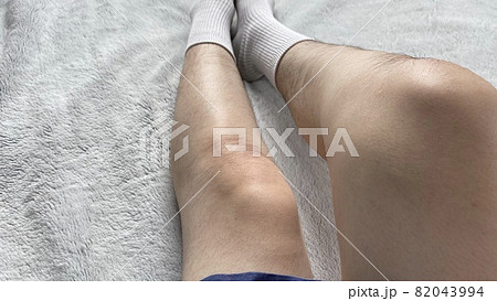 ムダ毛のたくさん生えた白靴下の女性の膝と脛