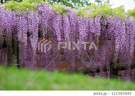 緑と調和する藤の花棚の美しい風景