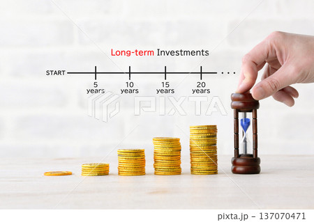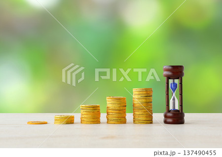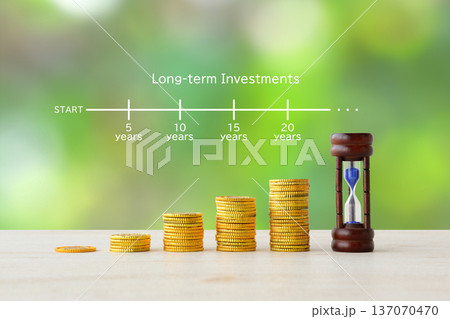 積み上げられた硬貨と砂時計―長期投資イメージ