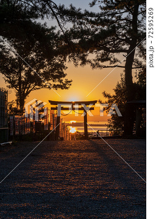 赤い夕日に照らされた鳥居と長く伸びる影(縦構図)