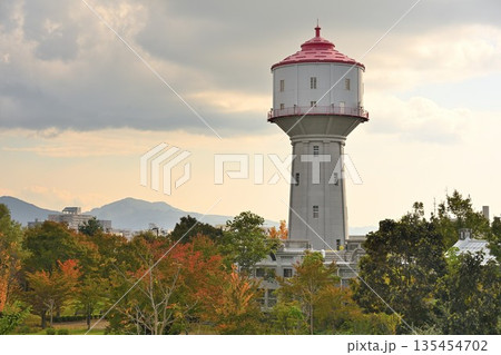 紅葉に囲まれた水道公園の水道塔(新潟県長岡市)