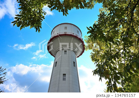 水道公園の遊歩道と水道塔のある風景(新潟県長岡市)