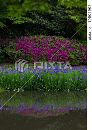 長岳寺放生池のカキツバタとツツジ