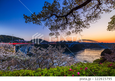 夕焼けに染まる西海橋に満開の桜と渦潮のコラボレーション