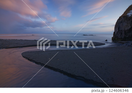 北海道白老町アヨロ海岸のポンアヨロ川河口と夕焼け