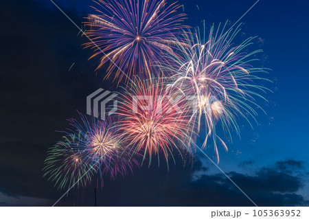 夜空に広がるカラフルな花火の一斉打ち上げ