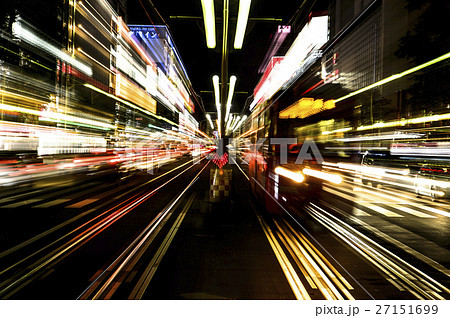 都会のビルの間を走る車のライトの光跡 福岡市内