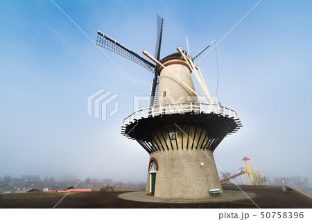 宮城長沼フートピア公園朝霧の中のオランダ風車