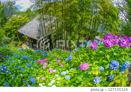 あじさいと日本家屋