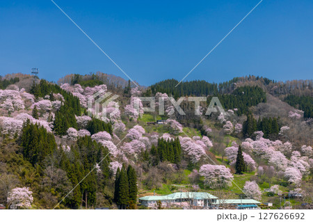 長野県上水内郡小川村高府 斜面一面にオオヤマザクラやエドヒガンなどが咲く二反田の桜