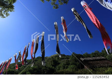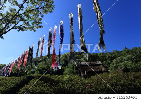鯉のぼりがはためく、千曲市森将軍塚古墳館 科野の村 復元住居