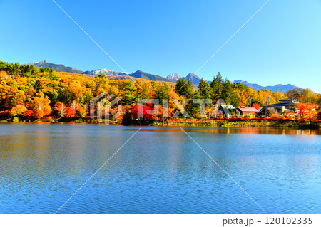 秋の長野県の白樺湖西側湖畔から東側の風景(蓼科山,池の平神社鳥居など)