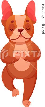 Brown french bulldog with closed eyes practicing yoga, meditating in tree pose, holding paws together, standing on one leg, finding inner peace and balance, cartoon vector illustration