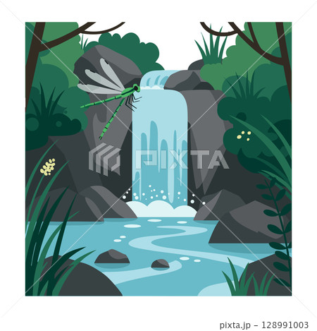 Dragonfly near waterfall in lush green forest with rocks and flowing water vector illustration