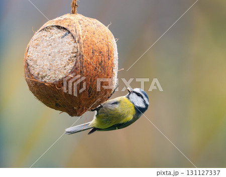 A delightful close-up of a Eurasian blue tit (Cyanistes caeruleus) hanging on a coconut filled with suet and seeds, gazing directly into the camera, capturing a perfect winter feeding moment