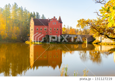 Panoramic view of Cervena Lhota Castle in the Czech Republic, surrounded by a lake reflecting its image. Autumn trees in vibrant colors and sunny weather create a picturesque, serene scene.