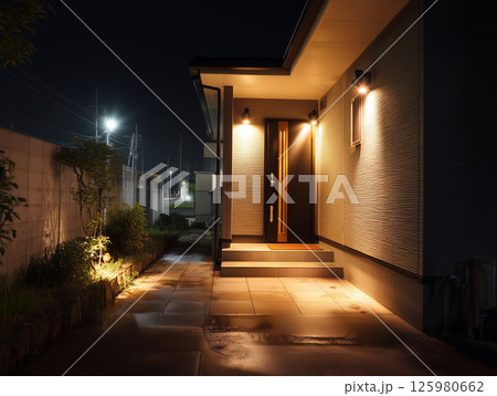 夜の住宅玄関と照明に照らされたアプローチの外構デザイン