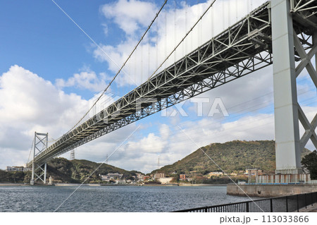 福岡県北九州市門司区の関門海峡に架かる関門橋と門司埼灯台