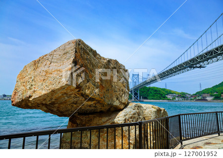 関門橋と青空 岩 奇岩 めかり 観潮遊歩道 奇跡のバランス