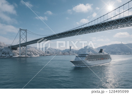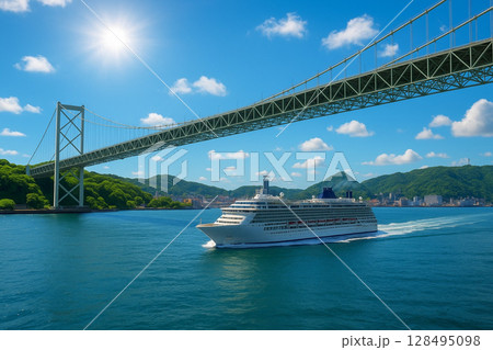 関門海峡を航行中の客船 ASUKA Ⅱ と関門橋