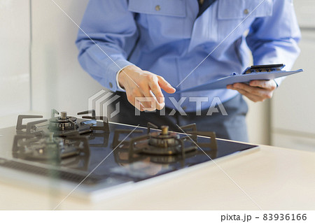 ガスコンロを点検する作業着の男性