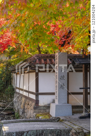 秋の京都 紅葉に包まれた天授庵の正門 「開山大明国師霊光塔」の石標