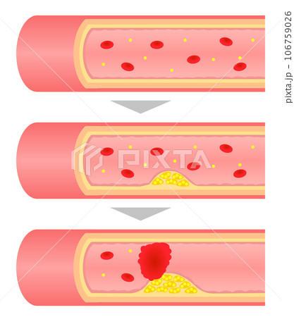 進行する動脈硬化の血管断面図の表情付きイラスト