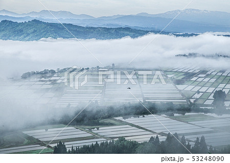 新潟県小千谷市池ケ原 信濃川から湧く霧と、田植えが終わったばかりの田んぼ