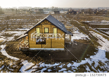 Aerial view of new wooden ecological traditional house cottage of natural lumber materials with steep shingle roof under construction on winter rural landscape background.