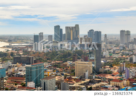 Modern residential areas and office buildings with Tonle Sap river in the background in rapidly developing Phnom Penh city panorama, Cambodia
