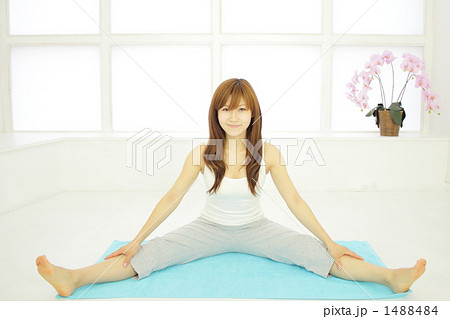 ダンスのやスポーツの準備運動をする女性 ストレッチで腕や足をのばす 開脚で前屈