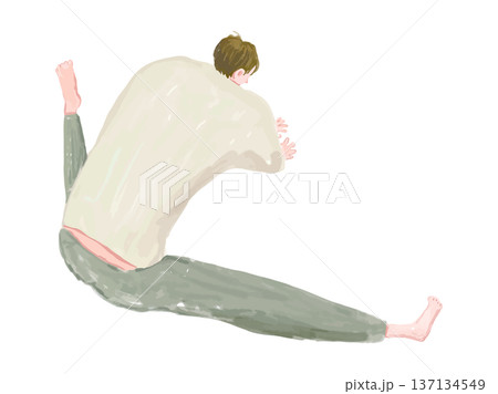 開脚ストレッチ・柔軟体操・クールダウン・準備運動・ウォーミングアップをする男性(股関節)