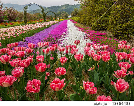 球根を太らせるため咲き終わった花をカットされたチューリップの花壇