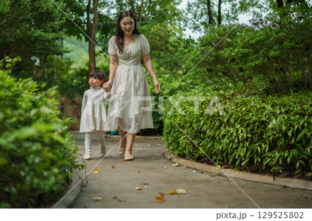 happy mother and toddler girl in white dress walking in garden