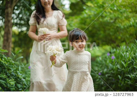 mother and toddler girl in white dress walking in flower garden