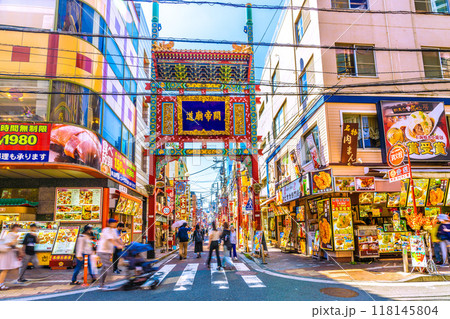 日本の横浜都市景観 9月、横浜中華街・関帝廟通り(奥)や関帝廟通(天長門)。開運コースは…=7日