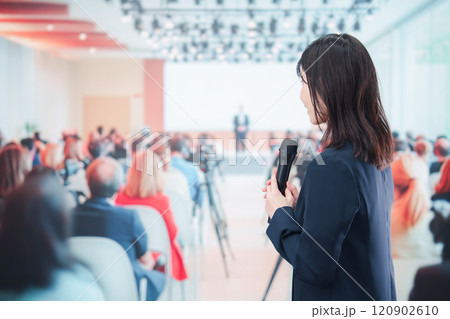 Back view of group of people gathering together in conference hall and listening to presentation of female speaker with microphone