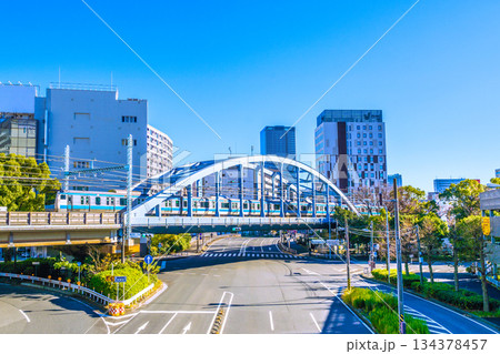 日本の東京都市景観 京浜東北・根岸線(先頭車両)などを望む。奥にベースゲート横浜関内タワー