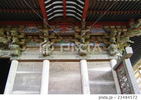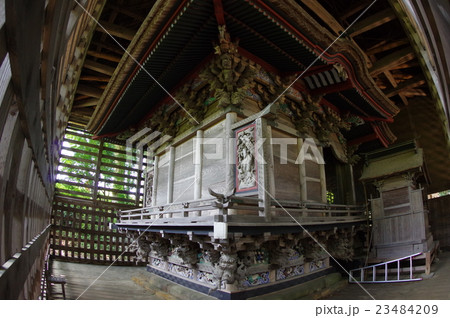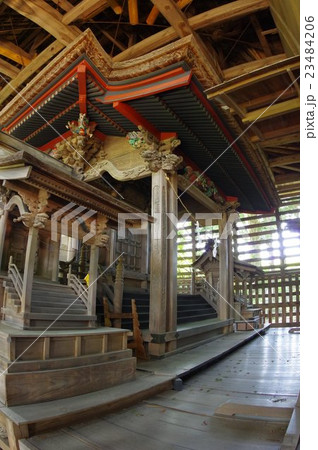信州 伊那の神社 熱田神社 拝殿俯瞰縦 本殿は国重要文化財 多くの彩色された彫刻が見事な本殿