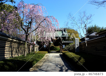 開花したシダレザクラが彩る福蔵院の山門(2)