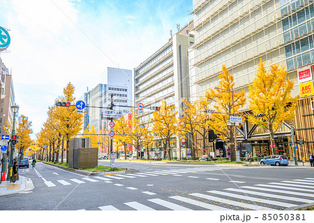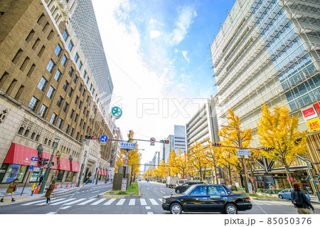 大阪府 秋の御堂筋のイチョウ並木と高級ブティック街