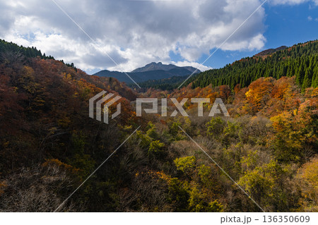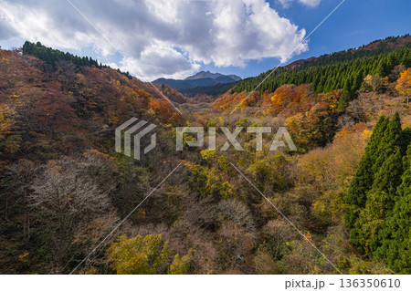 日本 鳥取県倉吉市関金町にある東大山大橋から眺める大山と渓谷の紅葉した木々