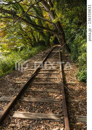 日本 鳥取県倉吉市関金町にある旧国鉄倉吉線、泰久寺駅の廃線跡の線路と紅葉した木々
