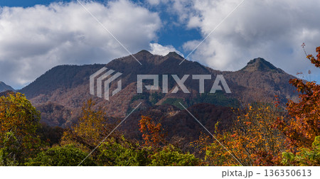 日本 鳥取県倉吉市関金町にある地蔵峠展望駐車場から眺める大山と紅葉した木々