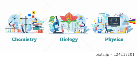 Science lab and school class with miniature people. Chemistry Physics and Biology.