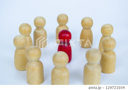 A red figure in the middle of mixed wooden groups, representing leadership or diversity or inclusion concept