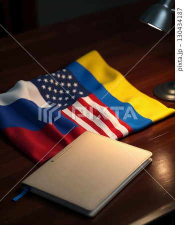 flags of Russia, Ukraine and the USA lie on a wooden table next to a folder with documents