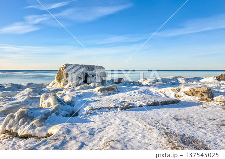Icy Fortification Ruins at Sunset, thick ice formations on the Baltic Sea Coast in Liepaja